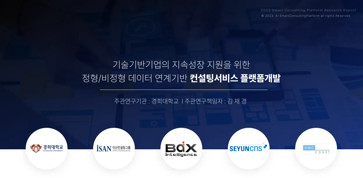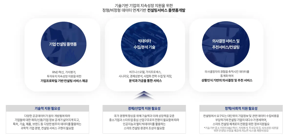 따라서, 본 정부 과제의 목표는 기업의 데이터를 분석하고, 컨설팅을 수행하는 프로세스를 자동화한 스마트 컨설팅 플랫폼을 구축하는 것입니다. 이를 통해, 해당 기업이 효율적인 의사결정을 수행하는 데 필요한 시간 및 공간적 비용을 줄이는 것이 최종 목표입니다.