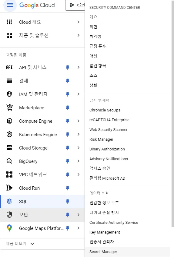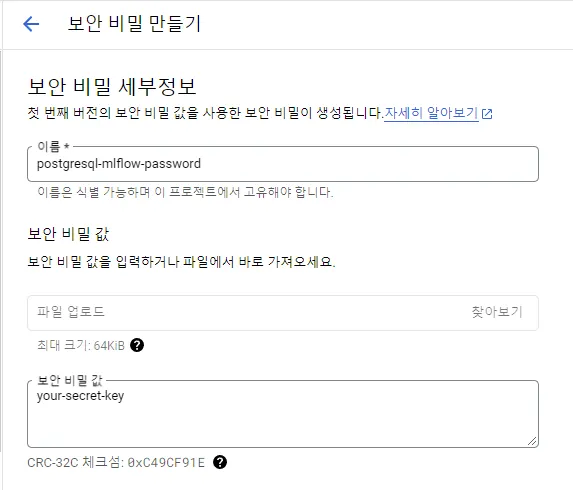 좌측 상단에 보안 비밀 만들기 버튼을 클릭합니다. 이는, 추후 VM 인스턴스(Tracking server)에서 SQL 인스턴스(Backend store)에 접근하기 위해 필요한 키(password)를 저장하기 위함입니다. 세부 내용은 다음 포스팅에서 설명드리겠습니다.