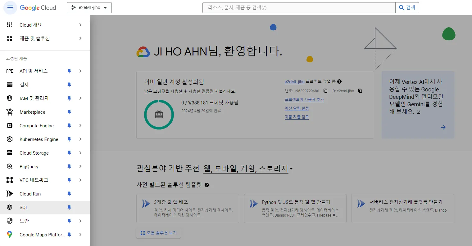 저의 경우, e2eml-jiho 라는 프로젝트를 사전에 생성하여 해당 번호를 선택하였습니다. 프로젝트가 없으신 분은 콘솔에서 생성해주시면 됩니다!