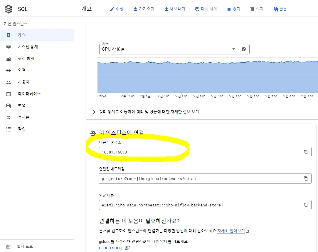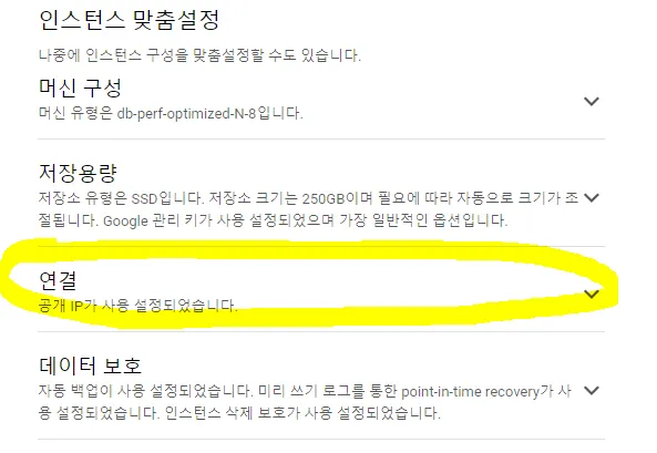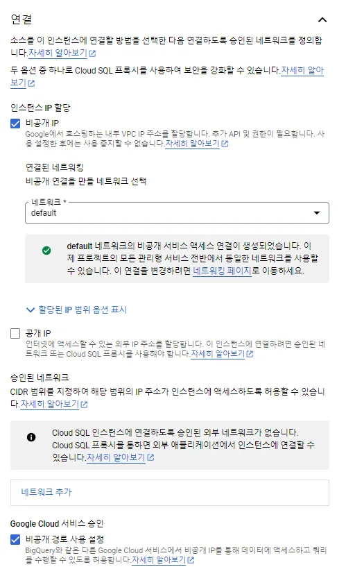 다음 그림과 같이 비공개 IP가 할당된 SQL 인스턴스가 생성된 것을 확인할 수 있습니다.