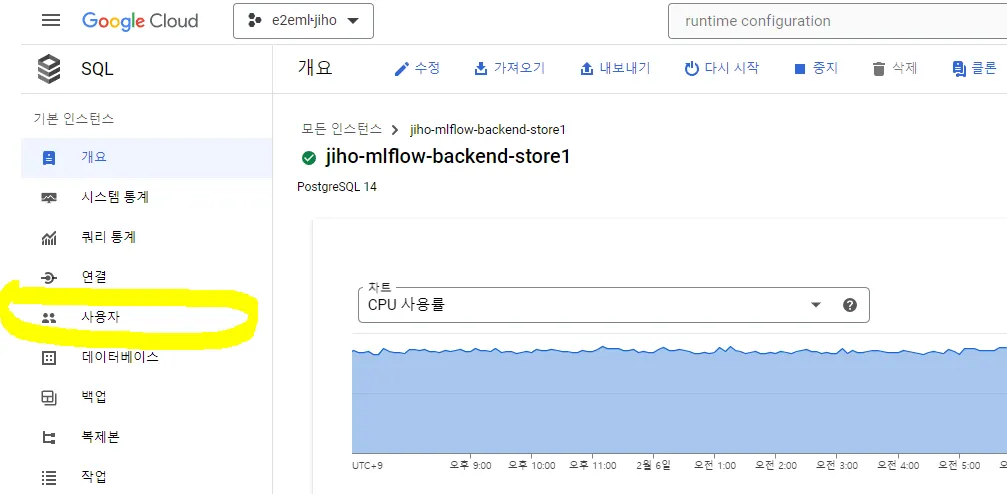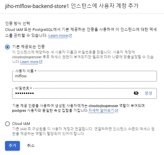 사용자 계정 추가 버튼을 클릭하여, 해당 인스턴스에 사용자를 추가합니다. 여기서 사용자 이름은 원하는 것으로 (저는 mlflow), 비밀번호는 5번 과정에서 생성한 SQL 인스턴스의 비밀번호 를 입력해줍니다.