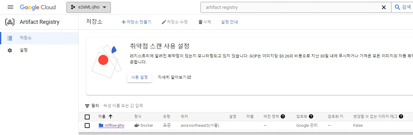 다음 그림과 같이 Artifact Registry가 생성된 것을 확인하실 수 있습니다.