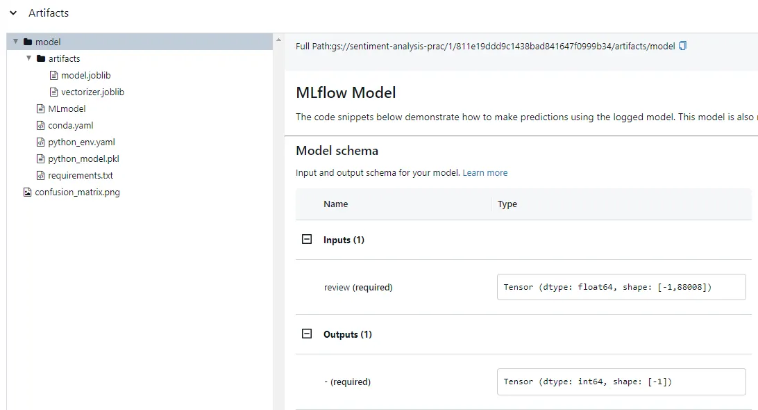 이때, 저장할 아티팩트는 학습된 모델과 vectorizer입니다. key-value 형식의 딕셔너리를 artifact 파라미터에 넘겨줍니다.
