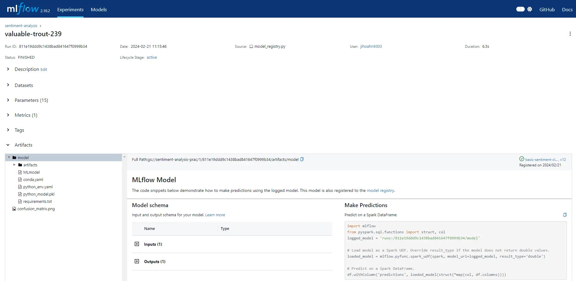 실험에 사용한 파라미터, 모델 성능, 아티팩트, 시그니처 등 여러 정보가 저장된 것을 확인할 수 있습니다.