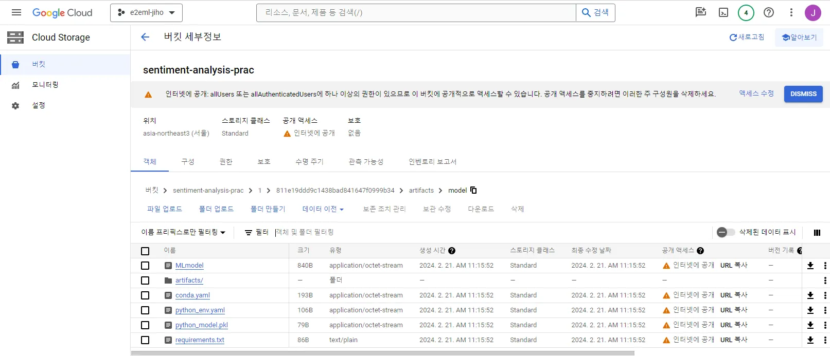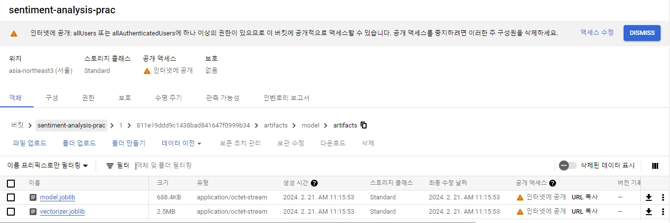 사진과 같이, Cloud storage 버킷에 학습한 Logistic Regression 모델, PythonModel 커스텀 모델 및 직렬화 된 vectorizer 객체가 저장된 것을 확인할 수 있습니다.