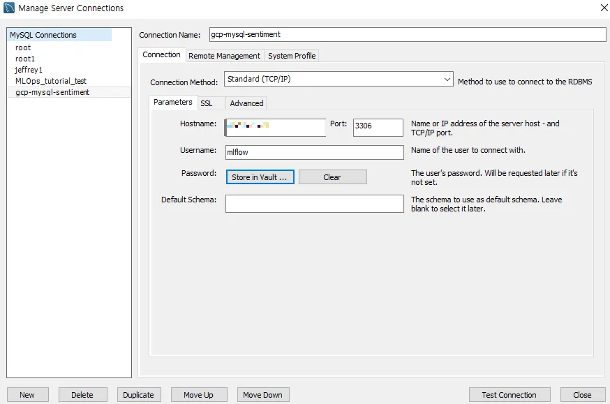 저는 MySQL Workbench를 통해 Cloud SQL에서 구동중인 MySQL 데이터베이스에 접근하고자 합니다. 다음과 같이, Cloud SQL 데이터베이스의 IP, 포트, 유저, 비밀번호를 저장해둡니다.